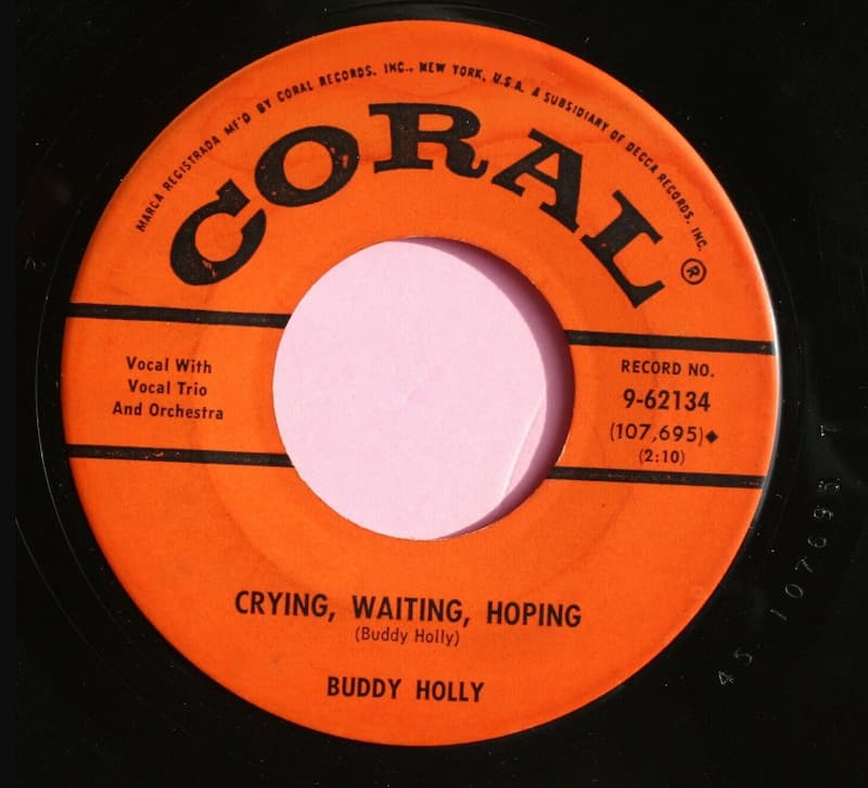 Hansen’s studio version of “Crying, Waiting, Hoping” was recorded on June 30, 1959, at Coral Records’ Studio A, along with “Peggy Sue Got Married”. Both sides were released as Buddy Holly’s first posthumous single. (The remaining four tunes on Holly’s tape were re-recorded by Hansen and company in 1960. All six were issued on an album, The Buddy Holly Story, Vol. 2.)