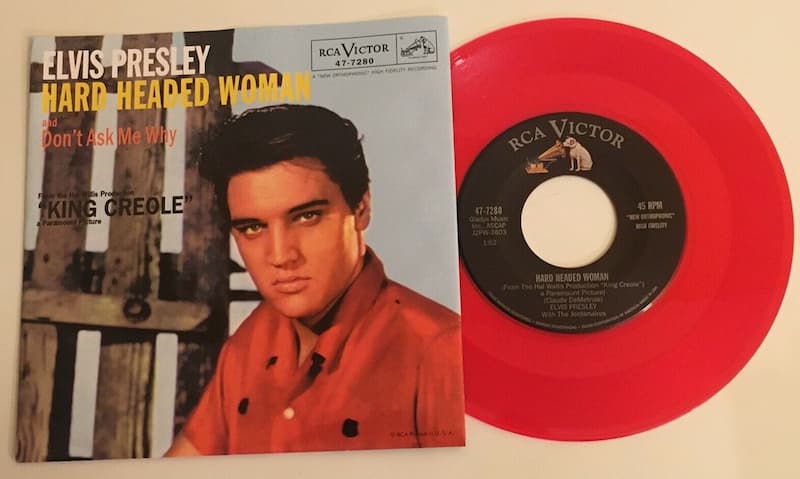 Elvis recorded Hard Headed Woman on January 15, 1958, at Radio Recorders for his film King Creole. Take #10 was chosen for release. Hard Headed Woman entered Billboard’s Top 100 chart at #15. The second week, it was #3. Despite this movement, the highest position the record would achieve during its 13 weeks on the chart was #2. Sheb Wooley’s The Purple People Eater kept Hard Headed Woman from ascending to the top spot. The record also reached #2 on both the Country Best-Seller and rhythm & blues charts. Sales quickly exceeded one million copies and a gold record was certified by the RIAA on August 11, 1958. It was the first of several gold records Elvis was to receive during his career. Hard Headed Woman was written by Claude DeMetrius.